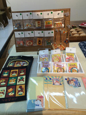 展示出展にもなったブローチやストラップアイテムや、めがね拭き、缶バッジ、一筆箋のラインナップです!