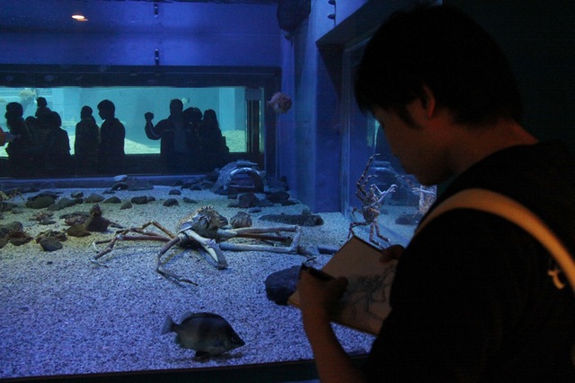 スケッチは、魚とかサメとか描いてましたけど、動きが早くて難しいってみんな言うてました(笑)カニは動いてなかったので描きやすいみたいです。