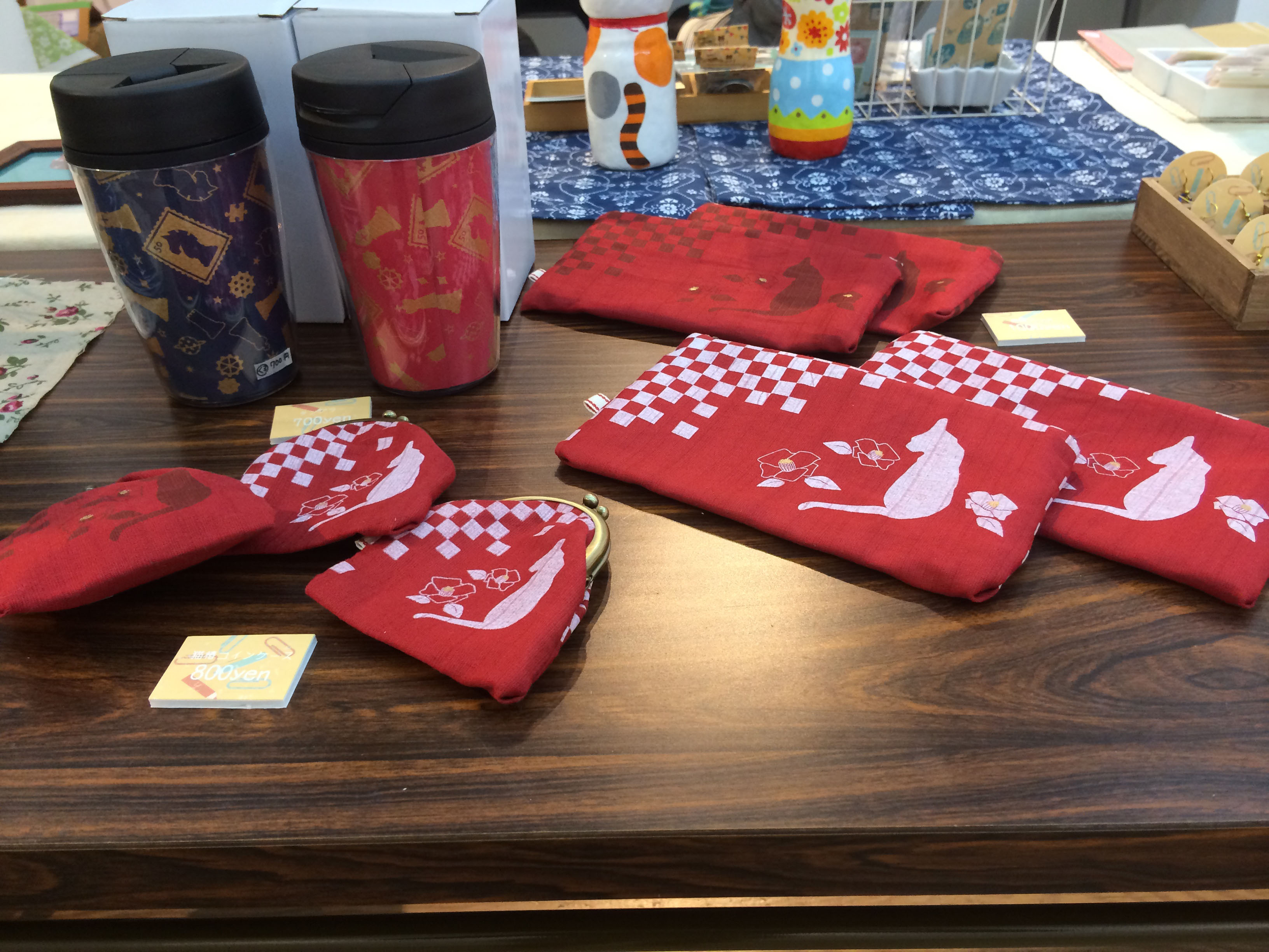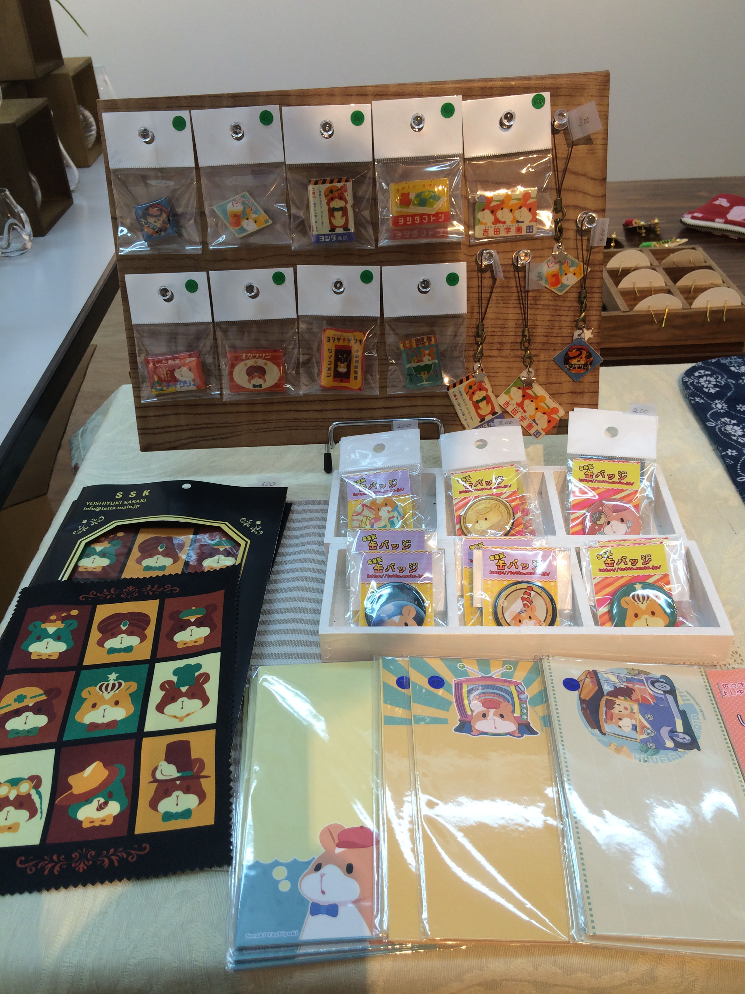 展示出展にもなったブローチやストラップアイテムや、めがね拭き、缶バッジ、一筆箋のラインナップです!